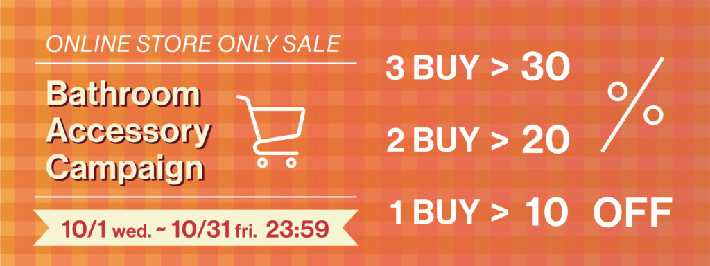 期間中、オンラインストアで販売中のバスルームアクセサリーを、ご購入点数により割引価格にて提供いたします。この機会に是非ご利用下さい。
